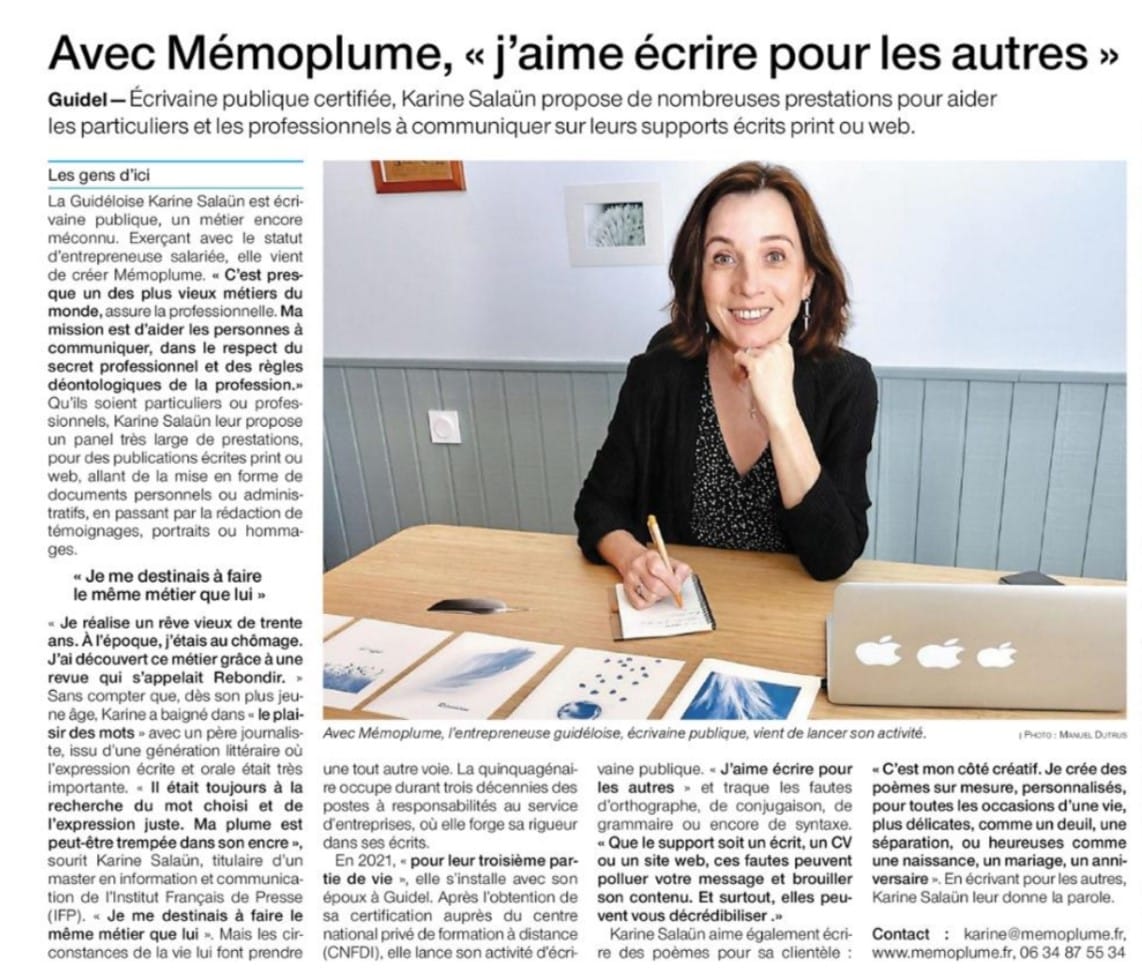 Découvrez Mémoplume, Karine SALAUN qui a choisi le statut d’entrepreneure-salariée avec FILEO Groupe pour entreprendre.